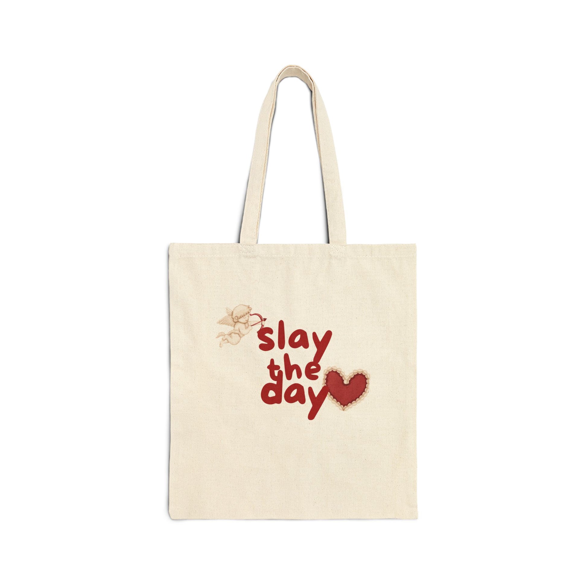 Slay the Day Canvas Tote Bag — Empowering Heart Graphic Cotton Shopper